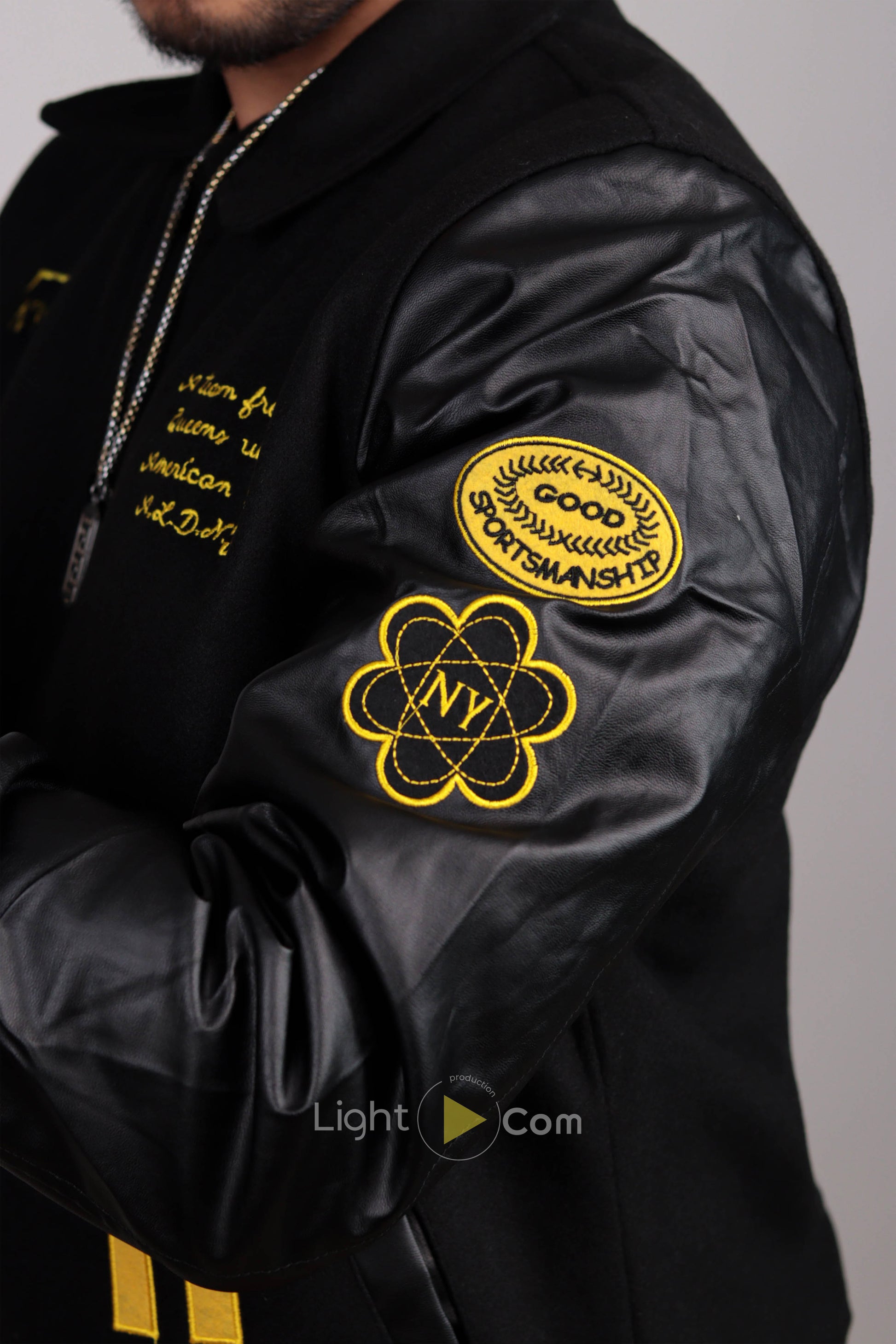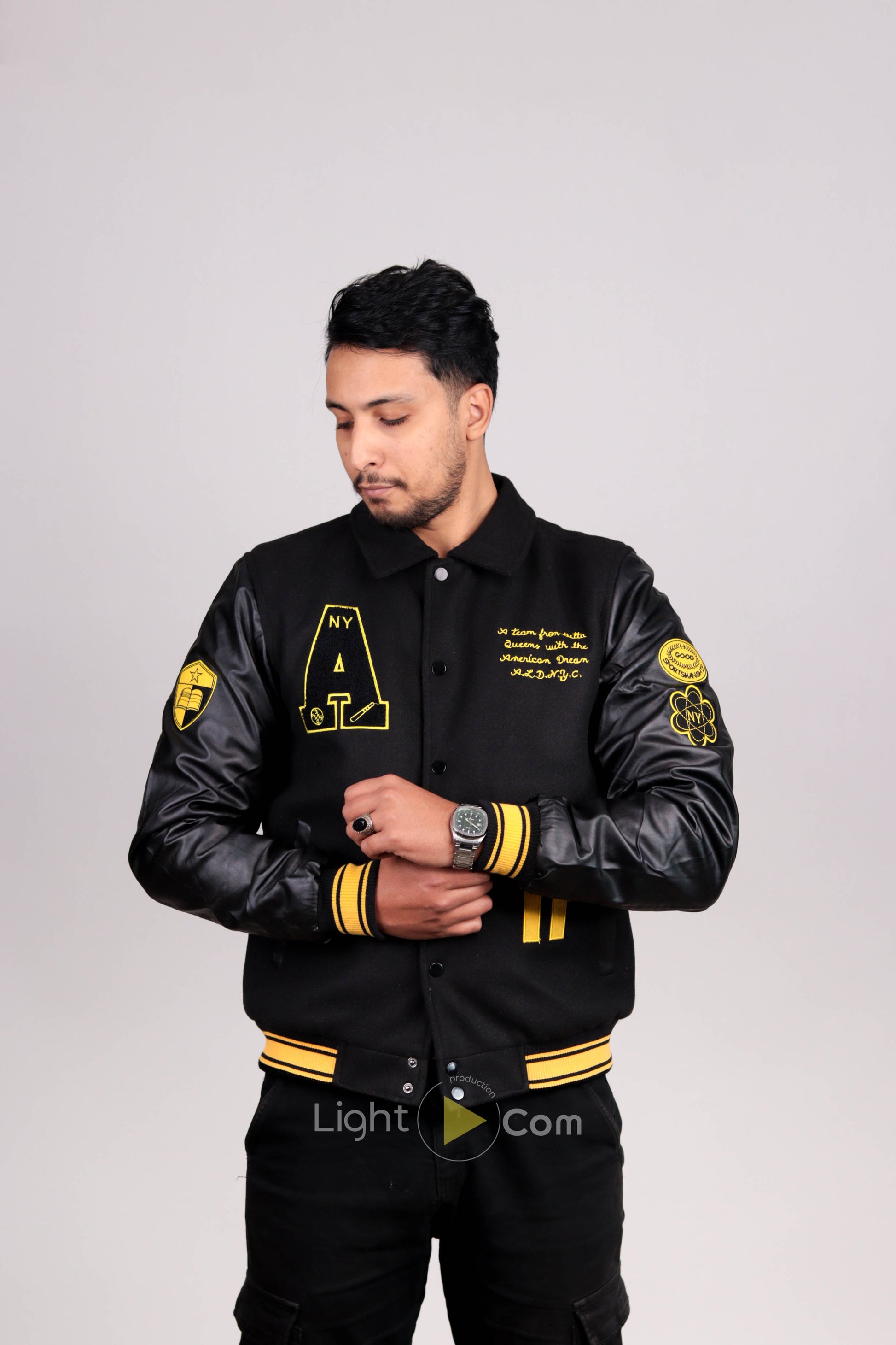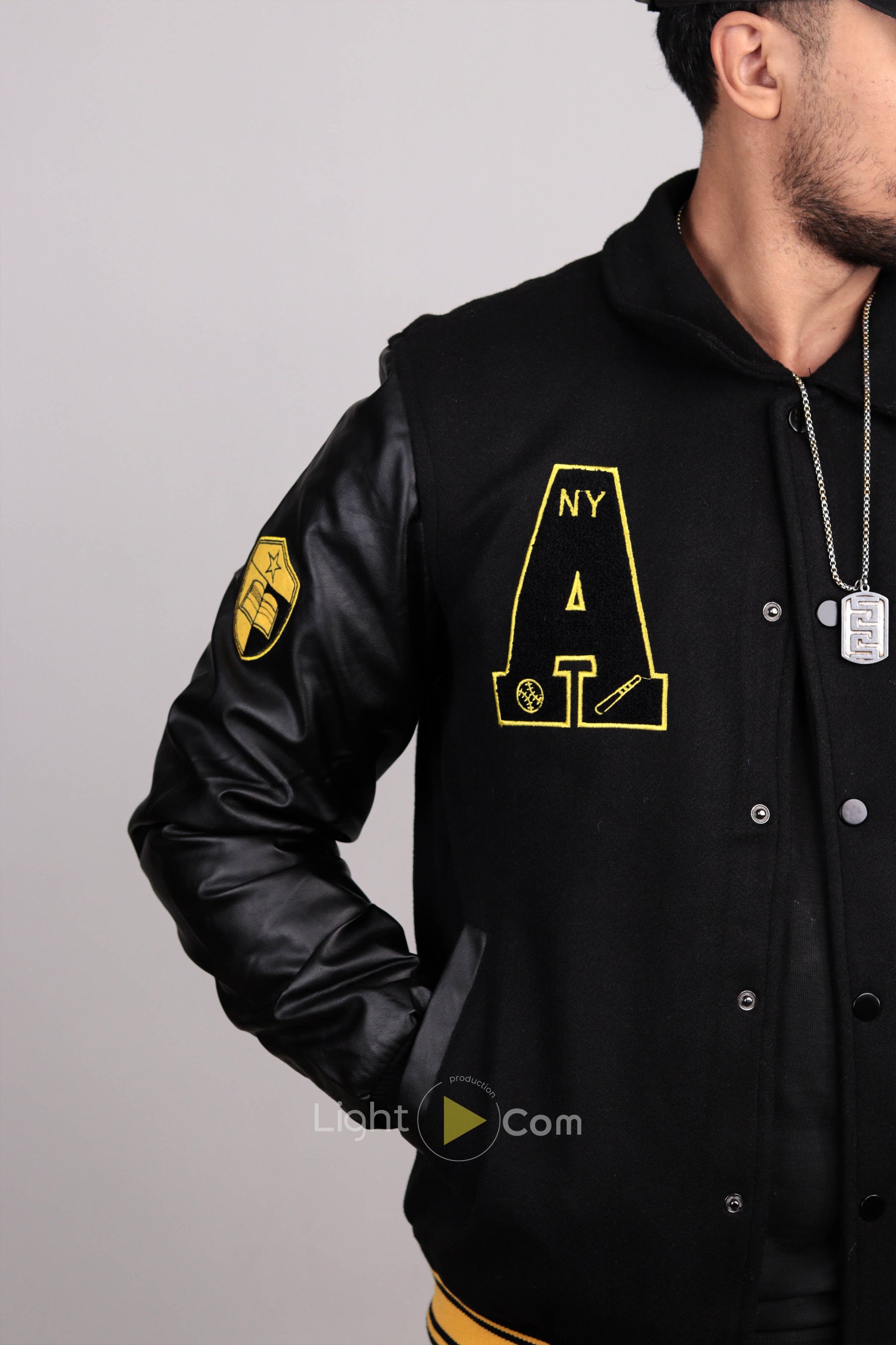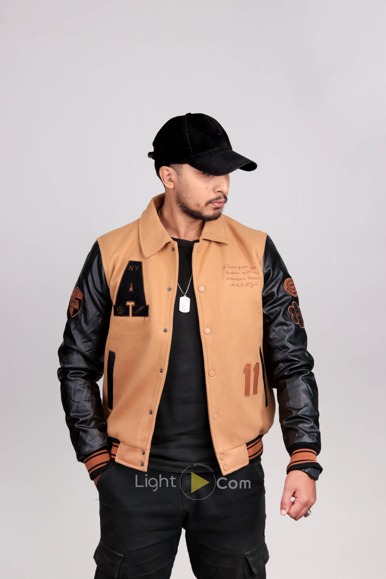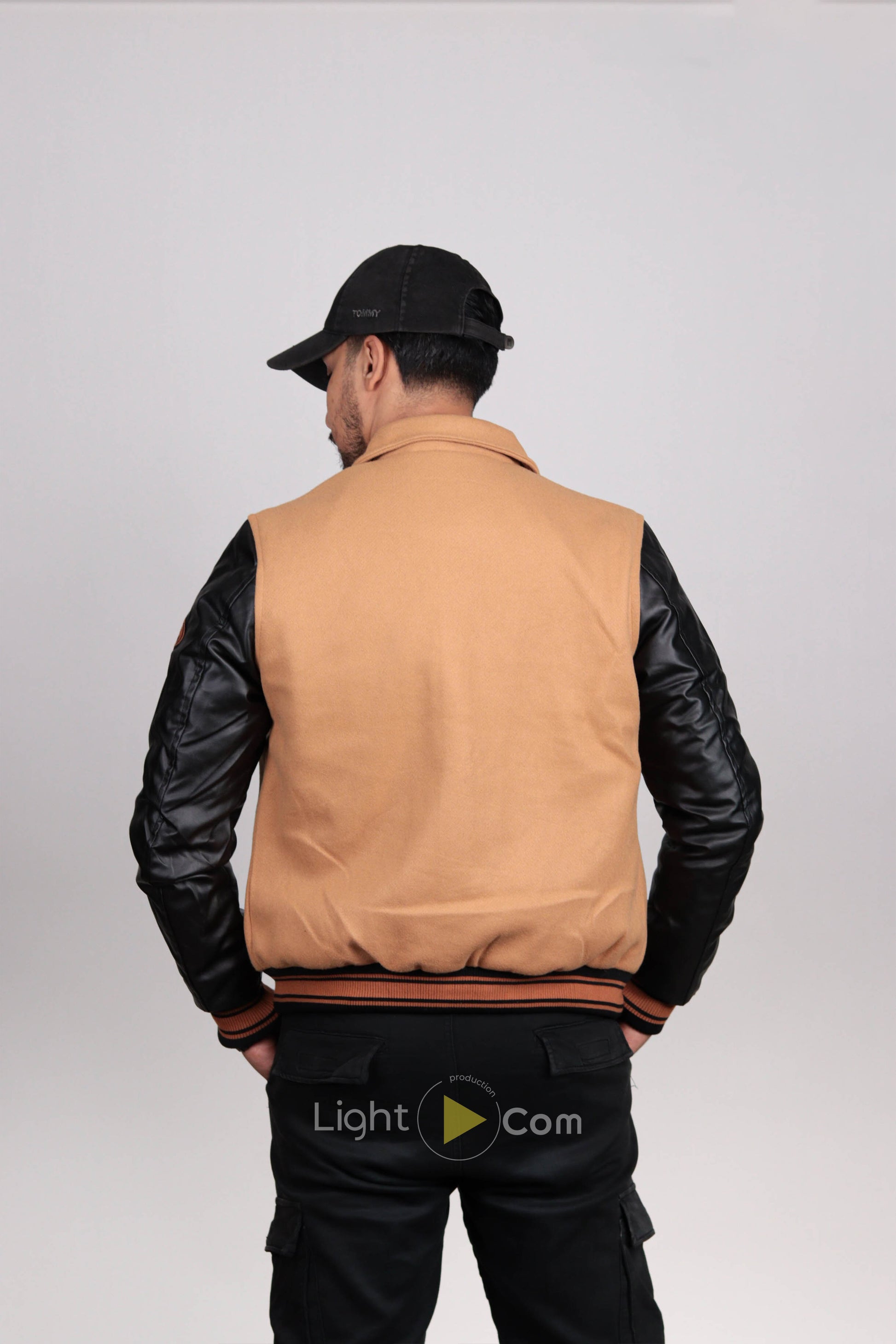 جاكيت فارسيتي رجالي بتصميم أمريكي عصري يتميز بقماش كاشمير صوفي فاخر مع أكمام جلد صناعي أسود نضيف لمسة قوية وأنيقة. تطريزات NYA يناسب الإطلالات اليومية والكاجوال.