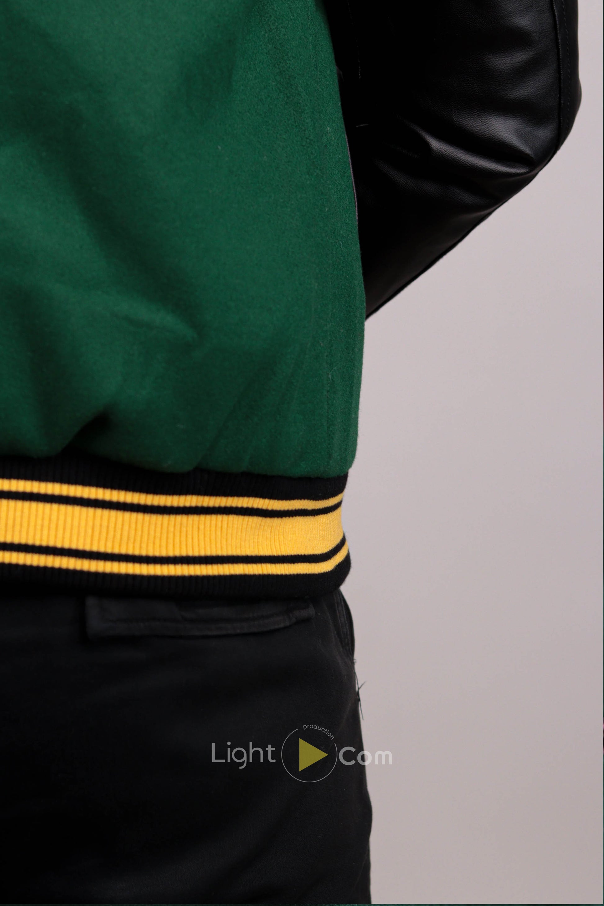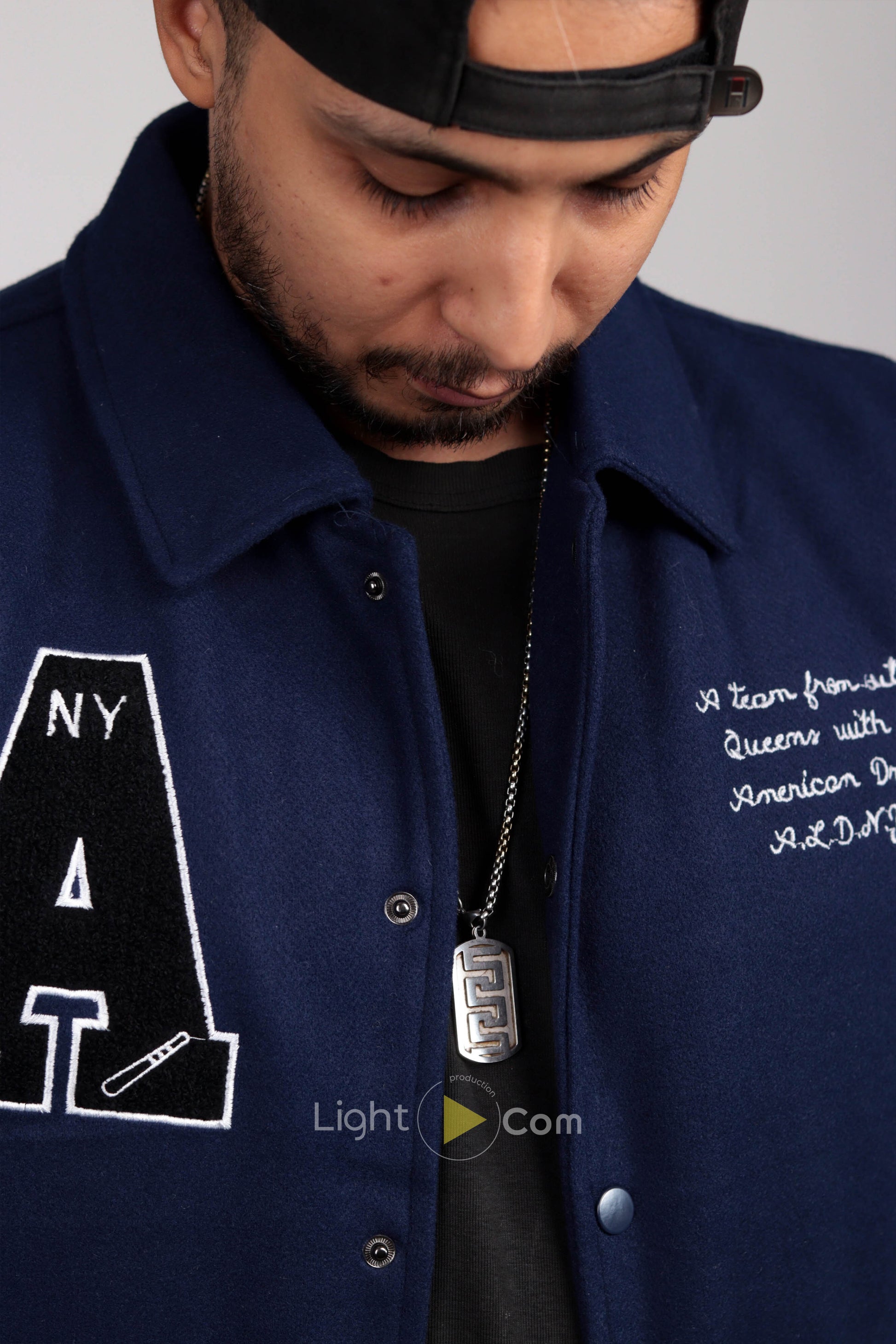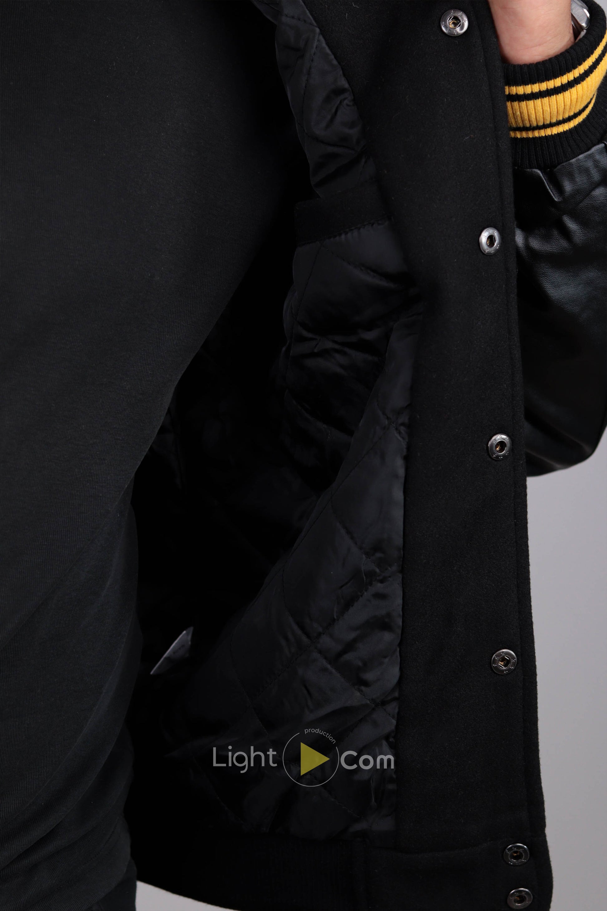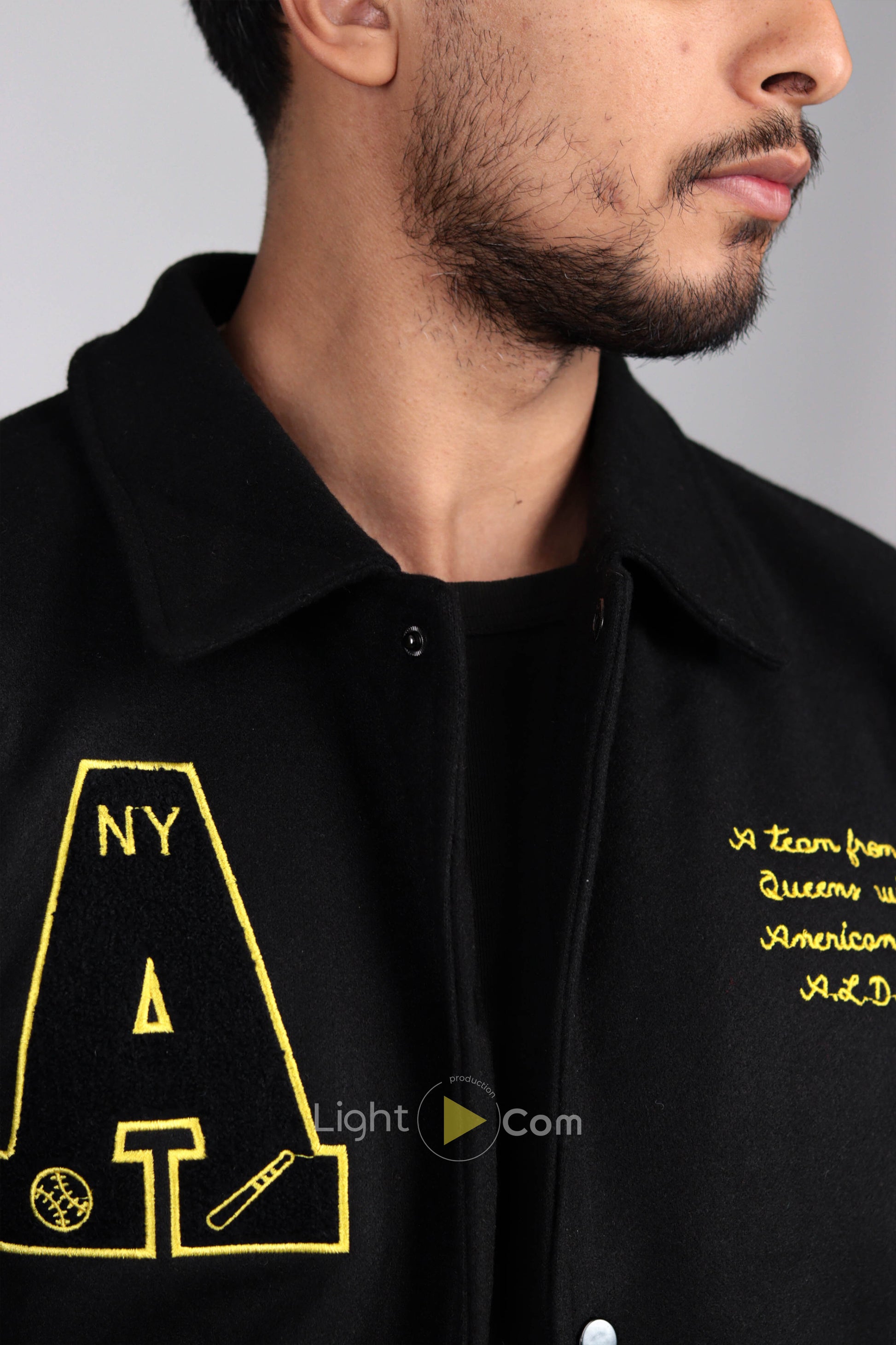 جاكيت فارسيتي رجالي بتصميم أمريكي عصري يتميز بقماش كاشمير صوفي فاخر مع أكمام جلد صناعي أسود نضيف لمسة قوية وأنيقة. تطريزات NYA يناسب الإطلالات اليومية والكاجوال.